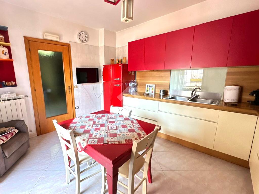 Accanto al soggiorno, una cucina abitabile di generose dimensioni invita a vivere la quotidianità in modo conviviale: qui si può comodamente pranzare in famiglia o godersi la colazione con la luce del mattino che filtra dalle finestre. Dalla cucina si accede a un balcone terrazzato, ampio e riservato, ideale per organizzare una zona pranzo esterna o semplicemente rilassarsi tra piante e fiori.